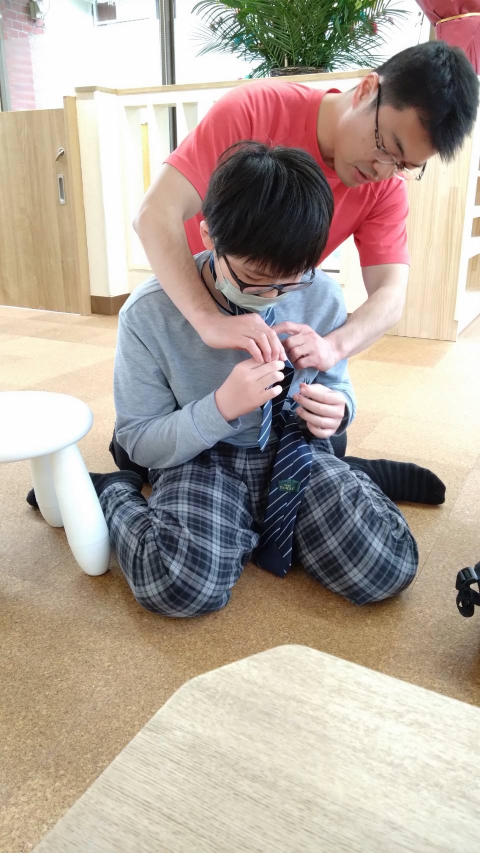 この日は写真のお子様が、中学校の入学式に向けてネクタイを結ぶ練習をしました。