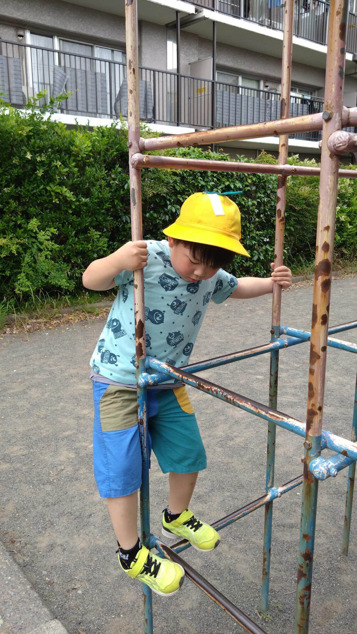 ジャングルジムに上った状態で、横に移動する遊びをしました。